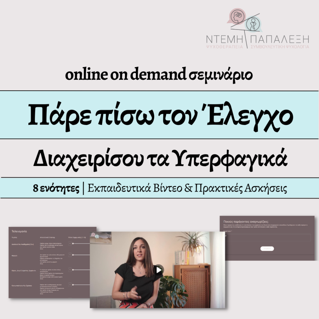 Το σεμινάριο αυτό, μέσα από βίντεο, ασκήσεις και πολύ υλικό, θα σε βοηθήσει να βρεις έναν πιο υγιή τρόπο διαχείρισης της κατάστασης που σε δυσκολεύει.